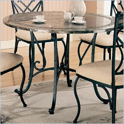 Coaster - Dining Tables - 120661 - Transform your kitchen or dining room with the distinctive travertine and marble style top of this round dining table. A metal base Features intricate scroll details and is bathed in a subtle black finish that contrasts beautifully with the creamy neutral upholstery on the coordinating chairs. A travertine and marble style pattern add texture and depth to the dining table and are repeated on the chair seat backs for a harmonious look. Enjoy the distinctive look of this round stone style table for years to come! Metal bases topped with travertine and marble style tops. Metal bases in a black finish. Rounded Marble Look Table Edge Detailed scroll accents dress up the base. Casual style Single Pedestal Round shape Specifications: Overall dimensions: 30.25H x 45W x 45D Weight: 109 lbs
